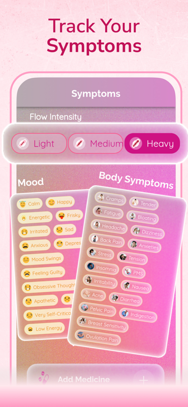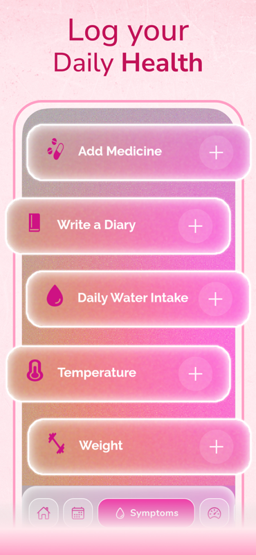 Log moods, flow, body symptoms, water intake, temperature, weight, and medicines